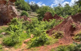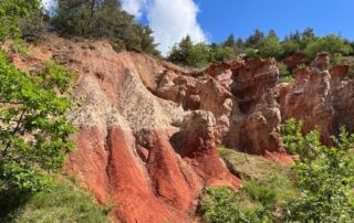 Balade dans le sentier des cheminées et fées de la Vallée des Saints à Boudes, site complètement insolite en Auvergne, sorte de Colorado aux terres ocres.